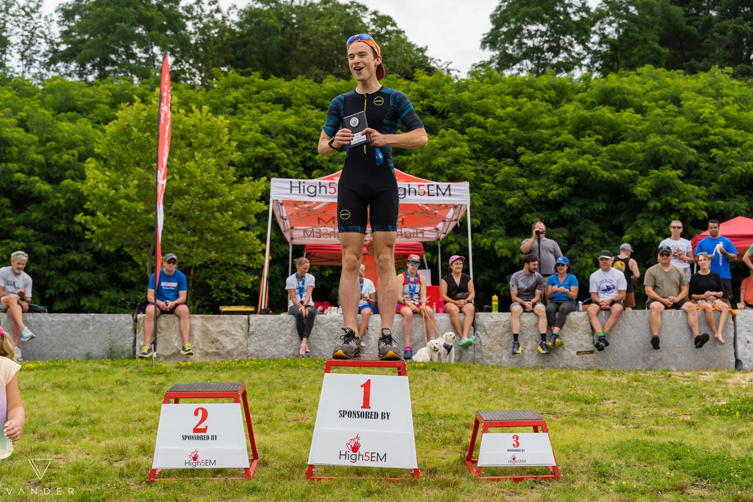 At the 1.5 mile turnaround I could see the racers behind me. After feeling a little bit of a side stitch I kept my 5:50/mile split constant until the last mile when I wanted to make sure I gave everything I had left. This was my race to defend now. I’ve been told to not look back in a race, but when you’re in the lead you have to. When I did I saw no one, which motivated me to run even faster. The Achilles still felt fine after the speed increase, and sooner than I knew it I was at the finish with a new personal record of 1:05:56. A couple seconds later after crossing the finish line, I saw Momma and we gave each other a big hug. We were so happy. I just won a triathlon for the first time.