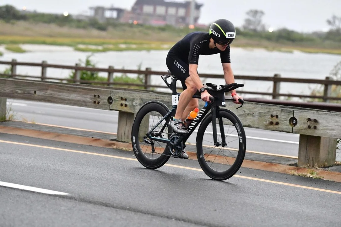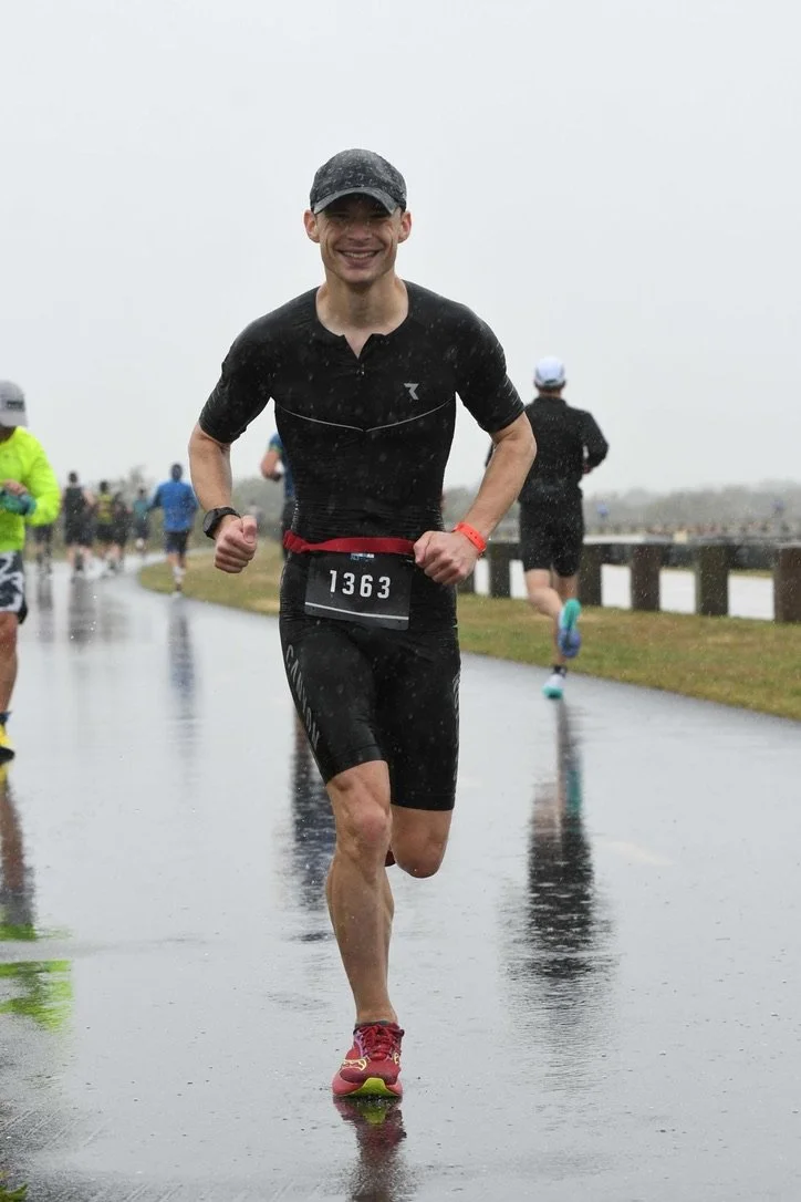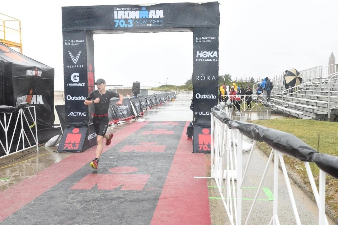 I have no issues running in the rain, I revel in it! I was feeling so good after the bike ride that I started running my 10K pace of 5:50 per mile. Realizing quickly that this was also because the course started with a tailwind I kicked it back a little to 6:20 per mile, but I was still passing other triathletes. I grabbed a gel early on in the run and a spectator in a thick Long Island accent asked me, “You vaping bro?” I was glad to see some spectator was having fun with jokes in the cold rain. Later I had another nutrition related incident at the turnaround. I thought I was grabbing water at an unmanned aid station but turned out to be Coke. Coke is actually good race fuel, but I recommend it should only be consumed towards the end of the race when you need a quick caffeine boost.