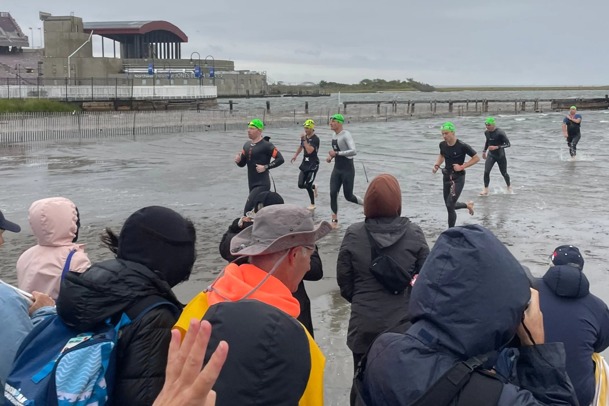 Cloudy with a very good chance of Triathlon! I’m in the blue suit near the starting line.