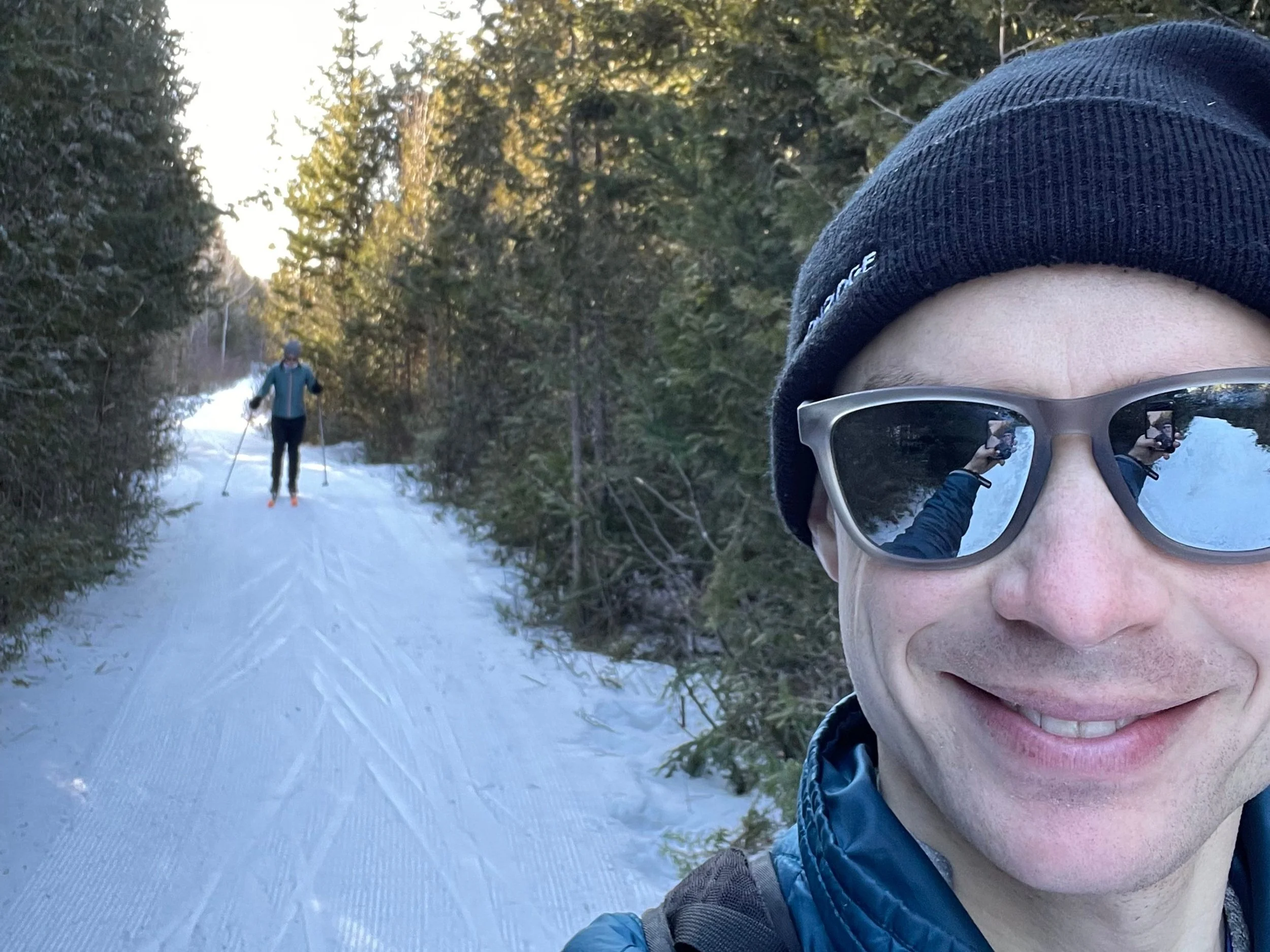 A few weeks after our half marathon race, Kerry and I had another overlap training session together doing something that’s not really done for marathon specific training… cross country skiing. For my birthday, we planned to go skiing up in Maine near Moosehead Lake at a place called Gorman Chairback. When I was an intern for New Hampshire Public Television, I was invited to help film a program about the Appalachian Mountain Club’s Maine winter huts. Me and the crew had such a blast skiing and filming up there. For years I hoped to return with someone really special, so I was over the moon when Kerry wanted to go too. If you want to learn more about this place, the program is still on PBS’s site here.
